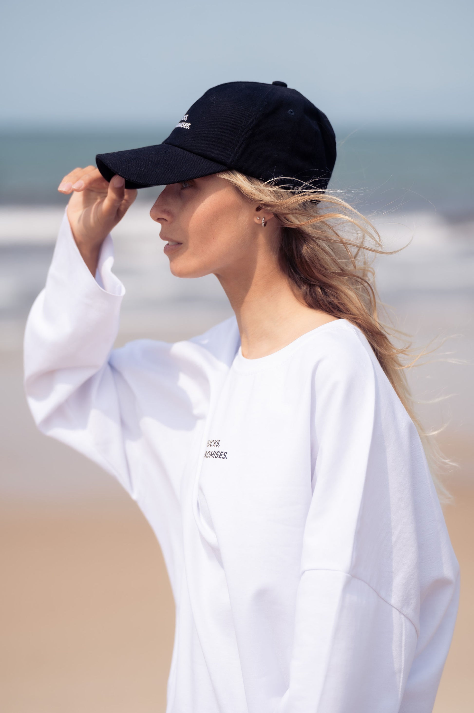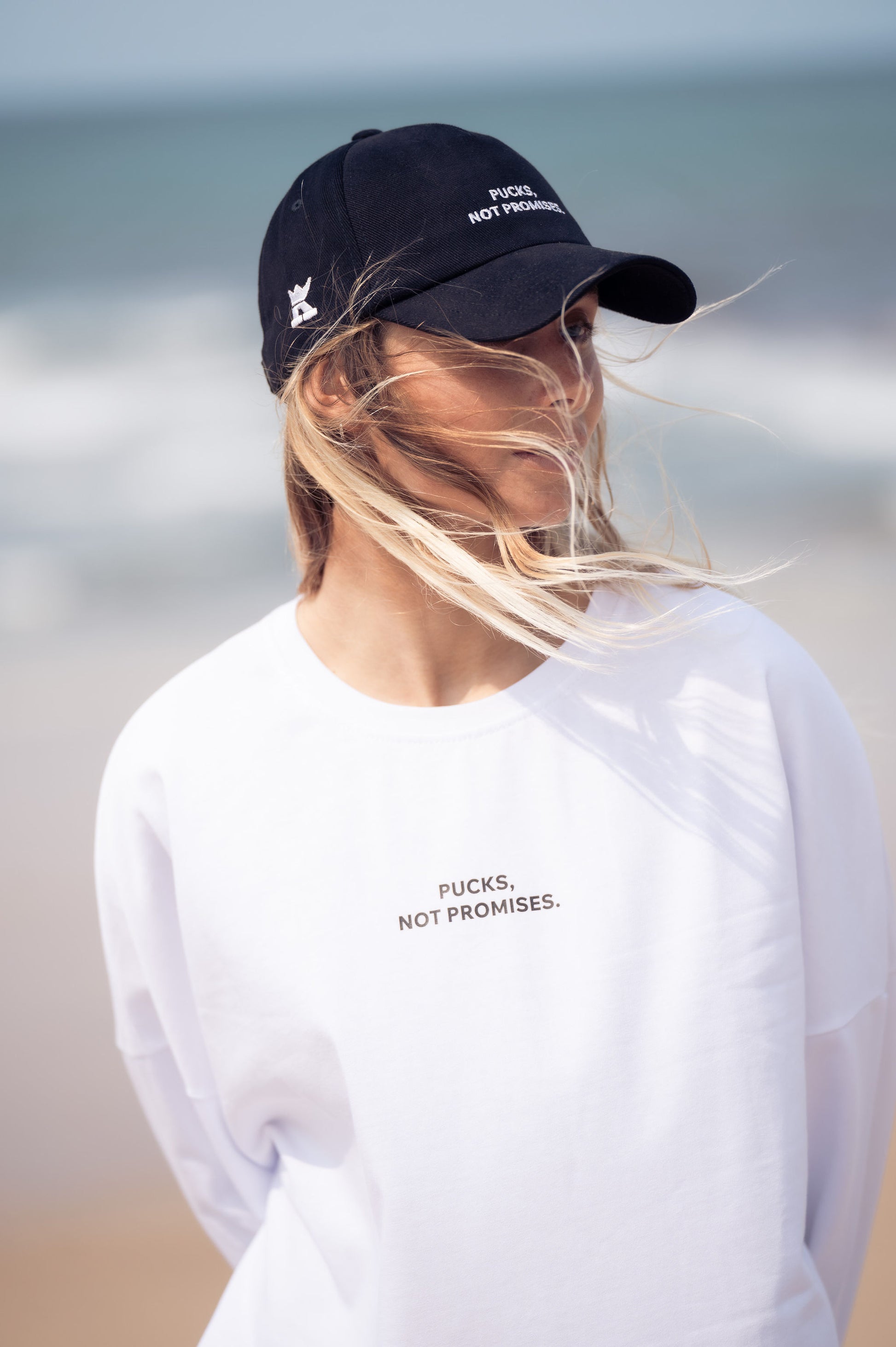 Ця чорна кепка сміливо заявляє: "Pucks, Not Promises" завдяки яскравій вишивці, додаючи грайливості й характеру вашому образу. Виготовлена з якісних матеріалів, вона поєднує надійність і комфорт, а регульована застібка забезпечує ідеальну посадку.