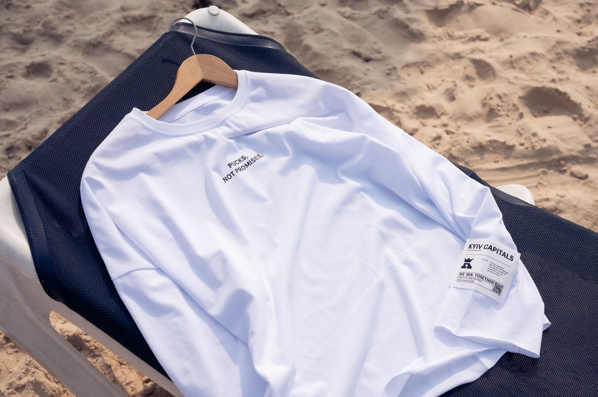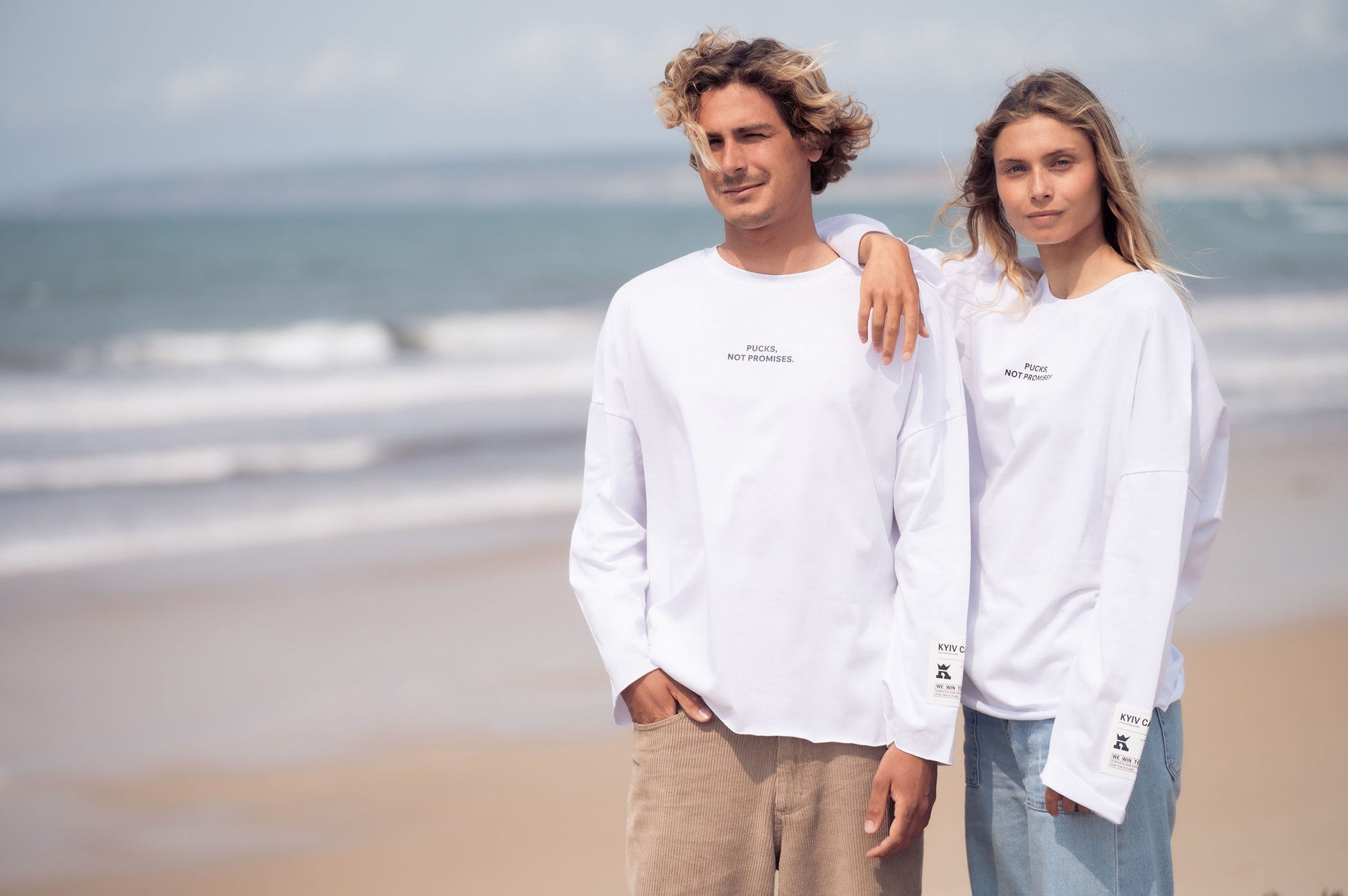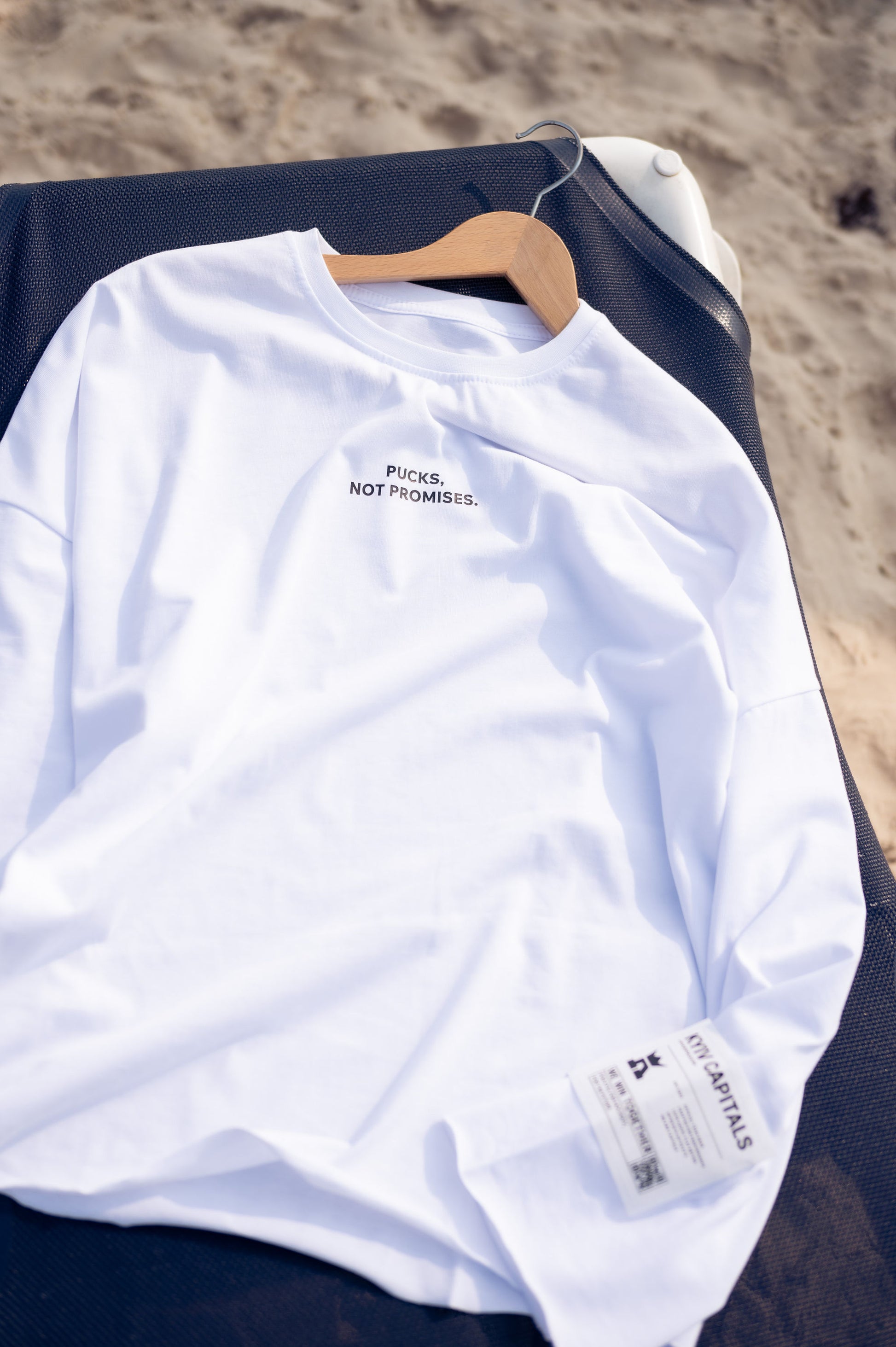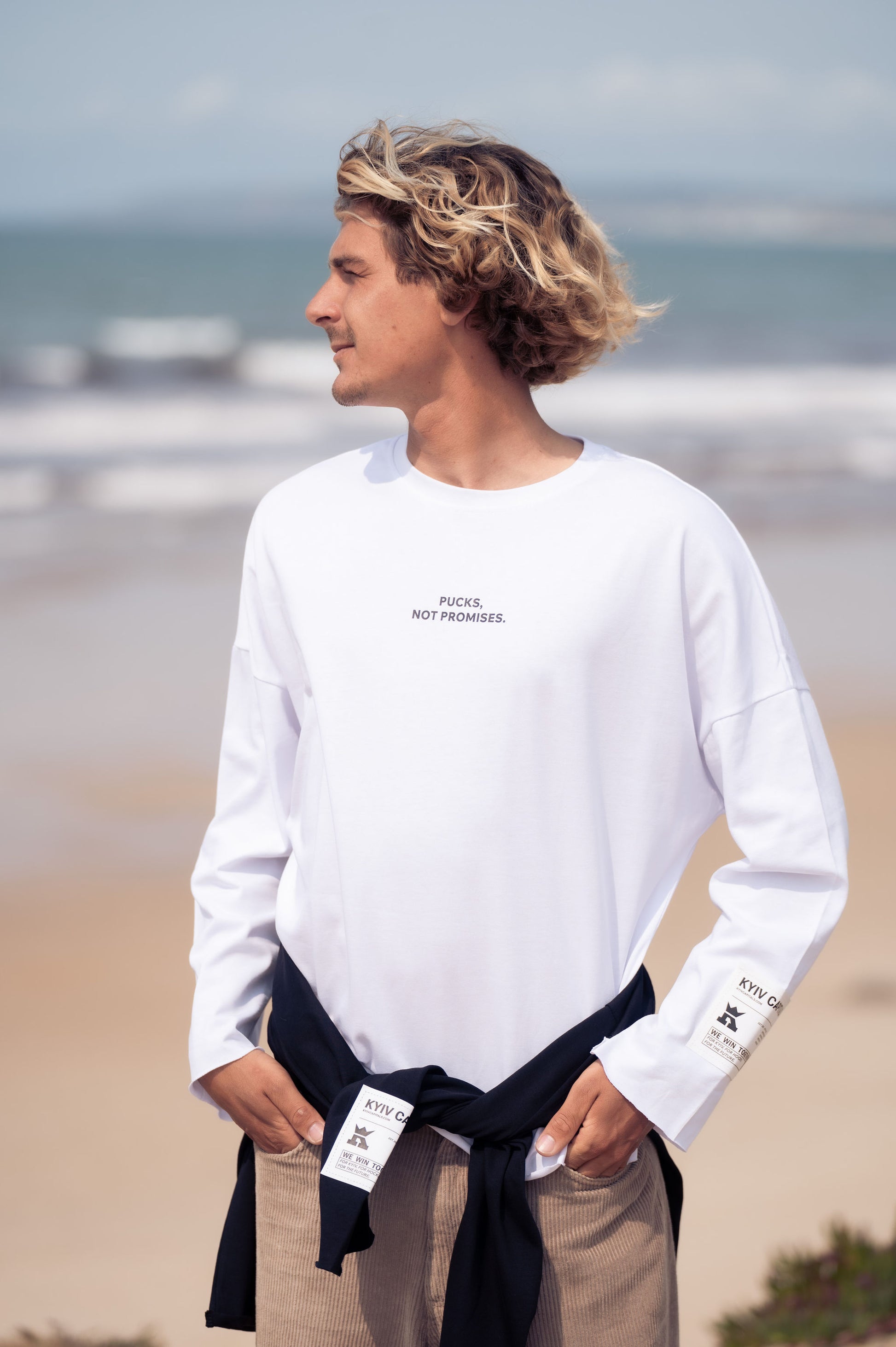 Світлий, легкий — цей лонгслів створений для літа. Принт «Pucks, not promises» на грудях і контрастна нашивка на рукаві додають стилю без зайвого шуму.